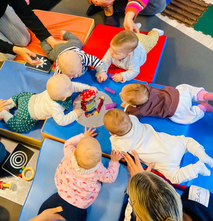 Es gibt einen „Babykurs“ für die bauchliegenden und robbenden Kinder und „Flohmotion-Gruppen“ für die krabbelnden bis laufenden und kletternden Kindern.